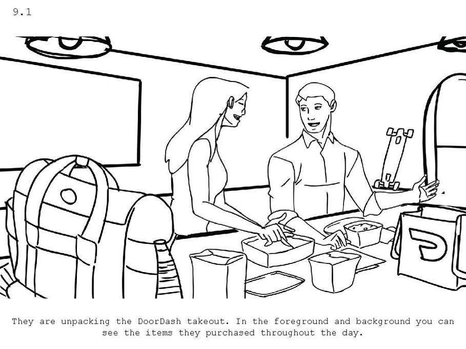 Este storyboard sigue un día en la vida de una pareja moderna, ilustrando cómo las interacciones digitales, la tecnología inteligente y la publicidad dirigida influyen en sus decisiones de compra de manera sutil pero impactante. La narrativa entrelaza sin esfuerzo momentos de la rutina diaria con la influencia de las redes sociales, los asistentes virtuales y los anuncios digitales, mostrando un viaje del consumidor sin fricciones.